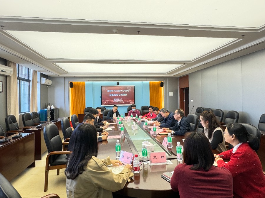 3 月 21 日,毕节开放大学党委书记、校长彭雄同志一行莅临我校交流调研,共商深化东西部交流合作事宜。我校党委书记、校长黄华兵和校领导班子及相关科室负责人与彭雄同志一行围绕开放教育发展多维度议题展开深入交流研讨,尤其在普法教育融入教育体系建设方面达成多项共识。