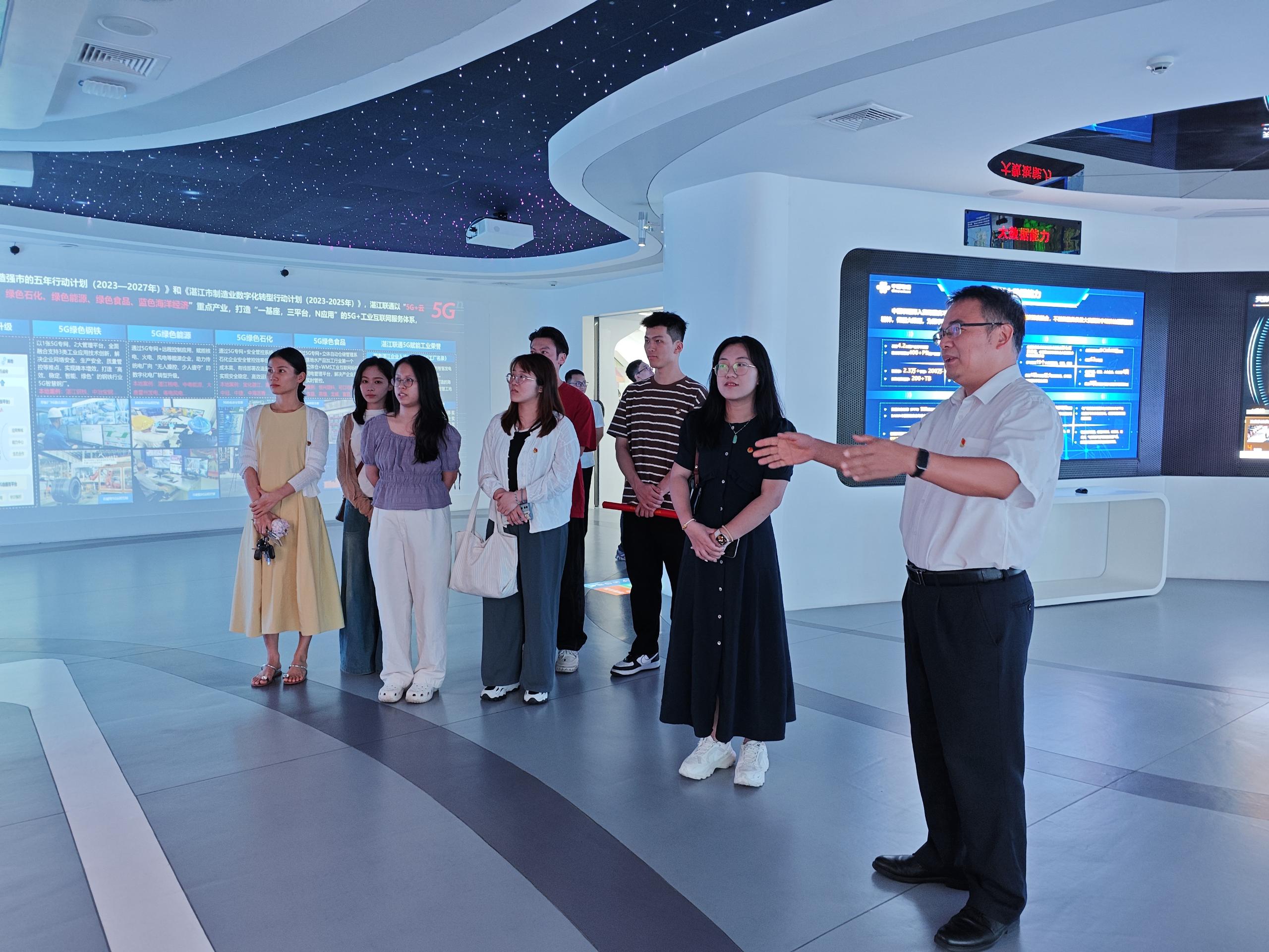 活动伊始,在中国联通湛江市分公司综合服务支撑中心党支部书记魏福建的热情引导下,我校第一党支部党员先后参观了湛江联通5G智慧展厅及党建馆,深入了解湛江联通在党建、社会服务、战略合作、智慧城市、智慧教室、后勤智慧化管理等方面的特色成效以及在通信领域的创新实践。大家认真聆听讲解,不时驻足交流,深刻感受到党建与业务深度融合带来的强大动力,在思想碰撞中汲取奋进力量。