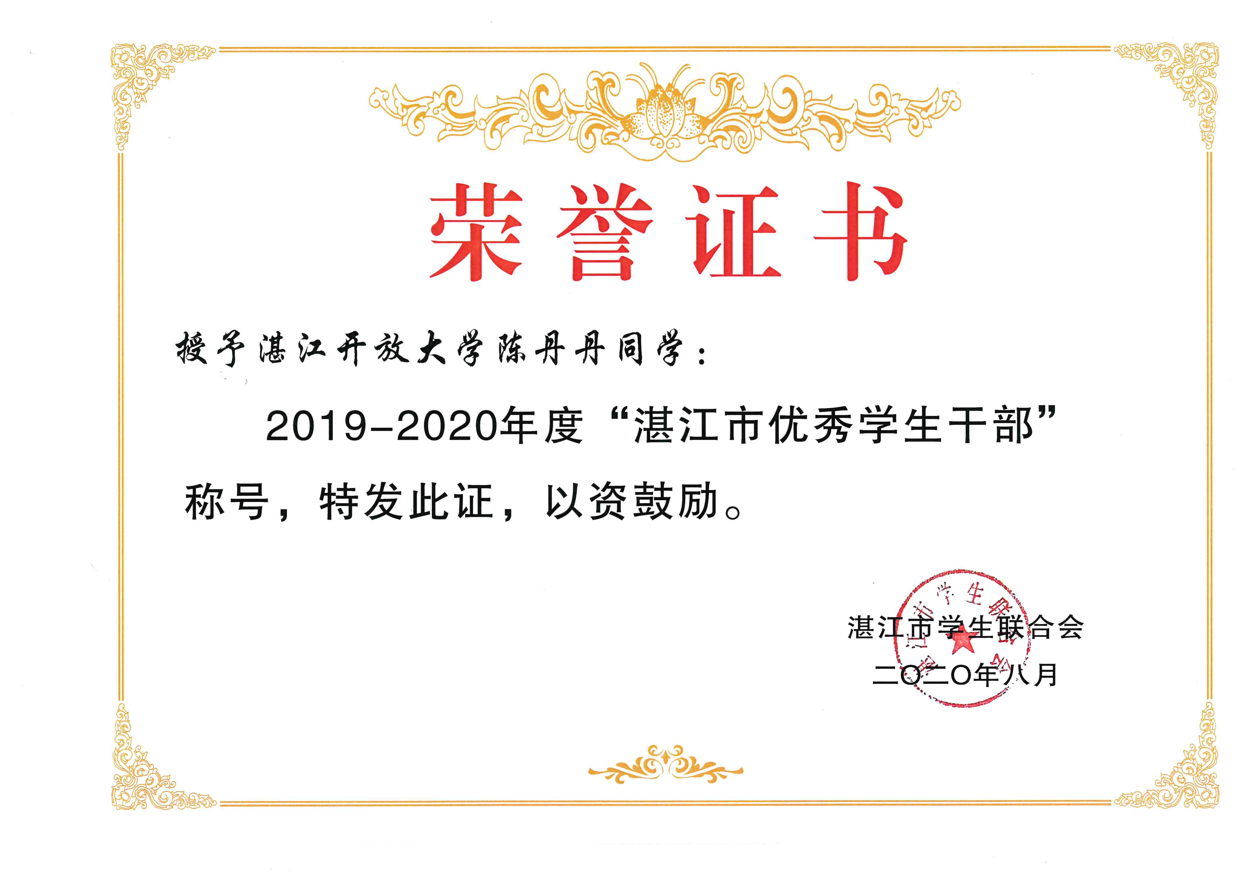 4.陈丹丹同学荣获2019-2020年度“湛江市优秀学生干部”称号;