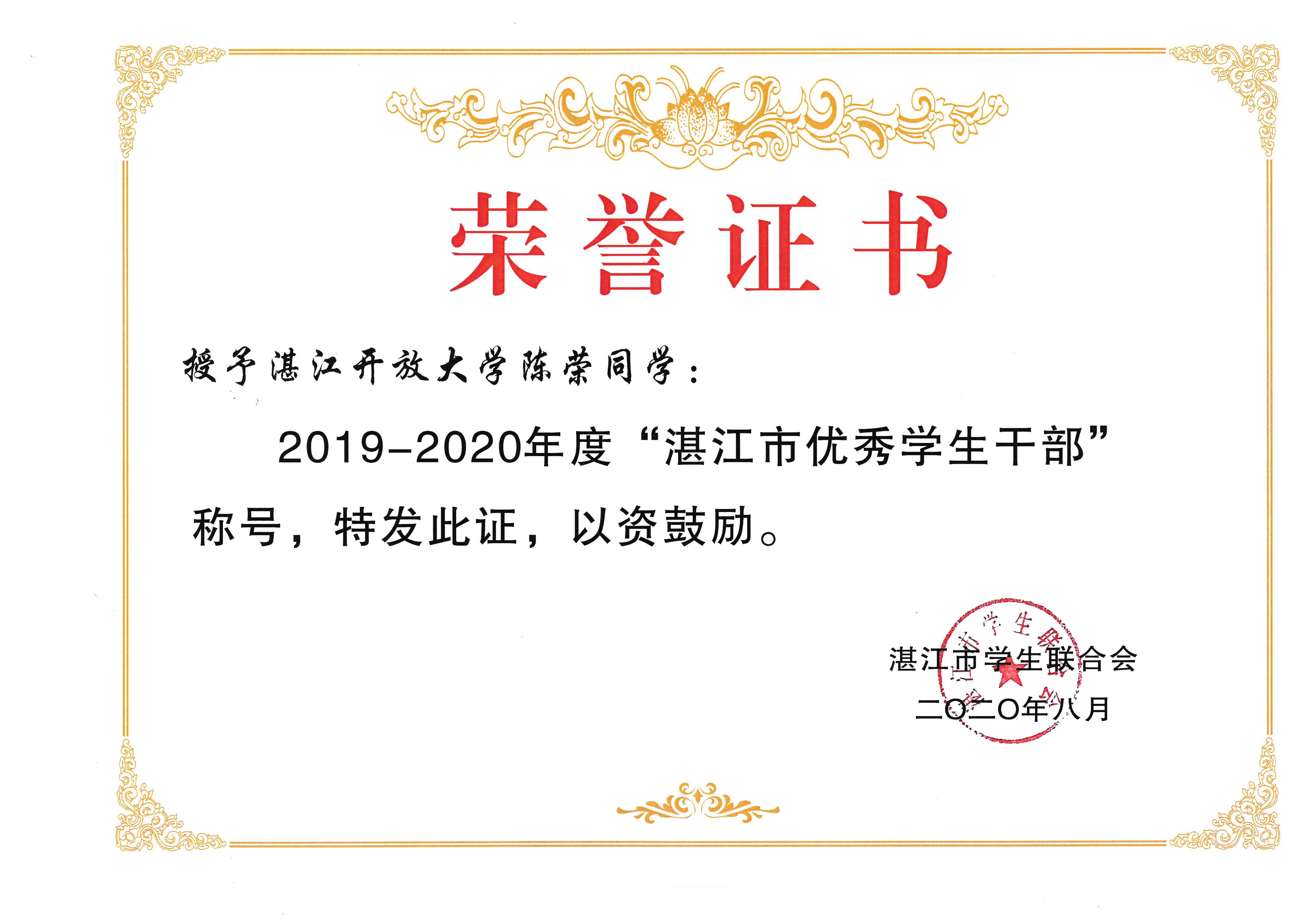 5.陈荣同学荣获2019-2020年度“湛江市优秀学生干部”称号。