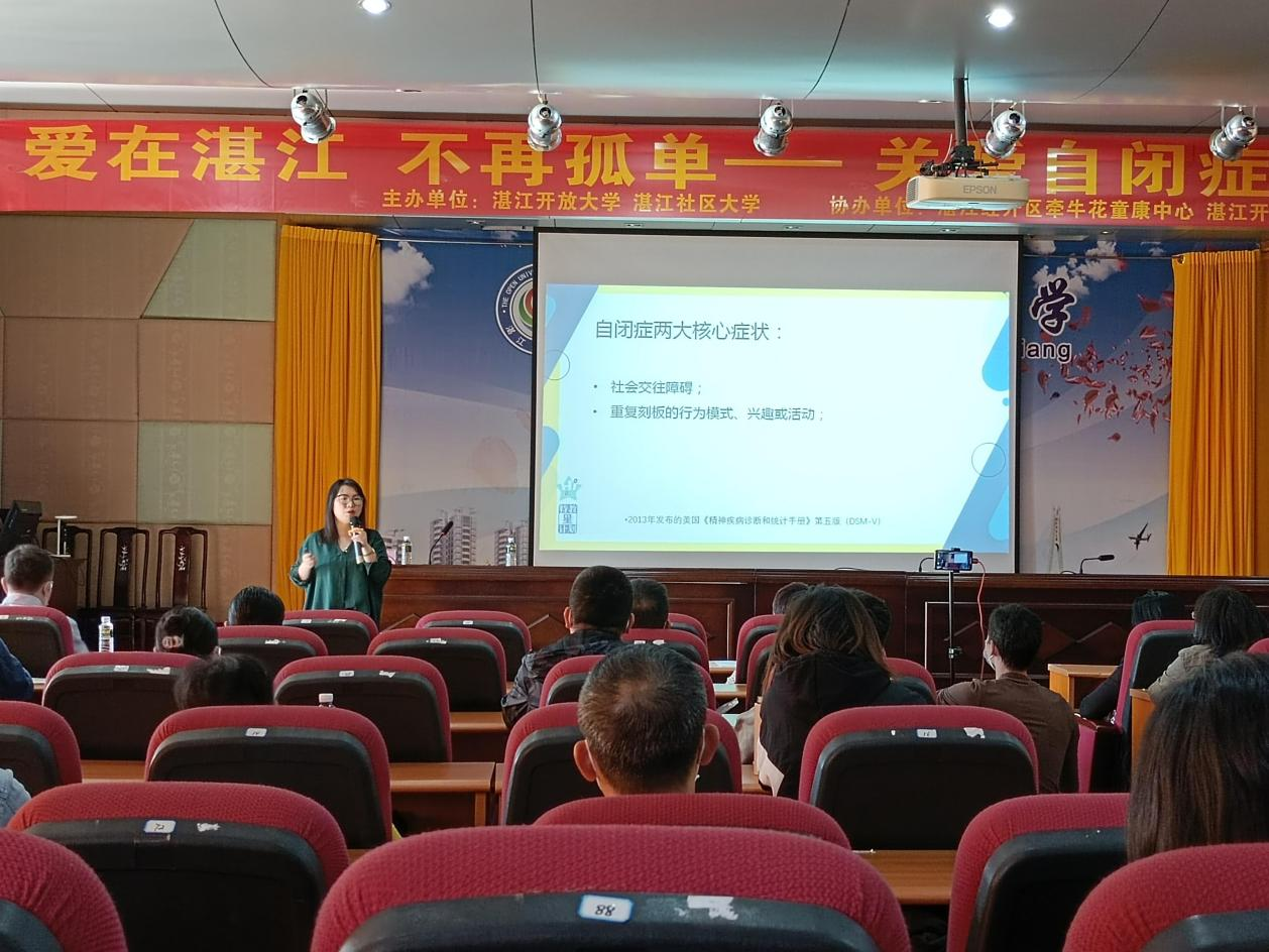 秉承"奉献、有爱、互助、进步"的服务精神,11月14日上午,湛江开放大学、湛江社区大学、湛江开大团委联合湛江经开区牵?;ㄍ抵行木侔?quot;爱在湛江、不再孤单"关爱自闭症家庭公益讲座。讲座邀请拥有13年一线自闭症教育教学经验的张驰老师,从自闭症的语言交流障碍、正确处理父母的情绪问题、重建特殊儿童家庭亲子关系、对特殊儿童的正向养育与支持、社交故事对家庭养育的帮助等方面进行了讲解。