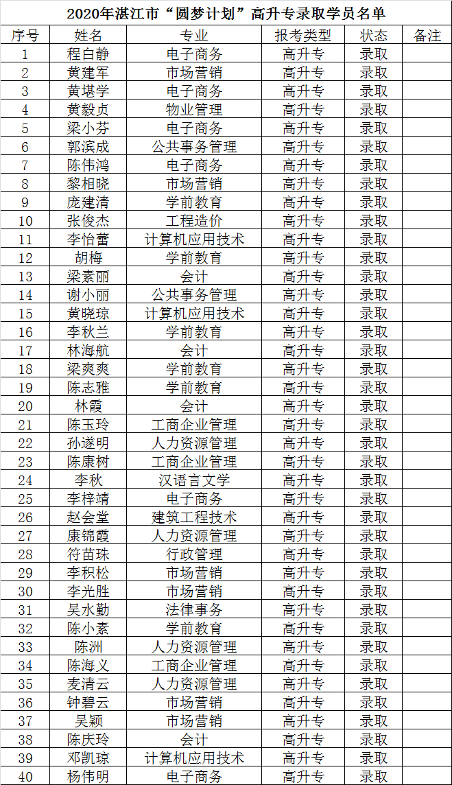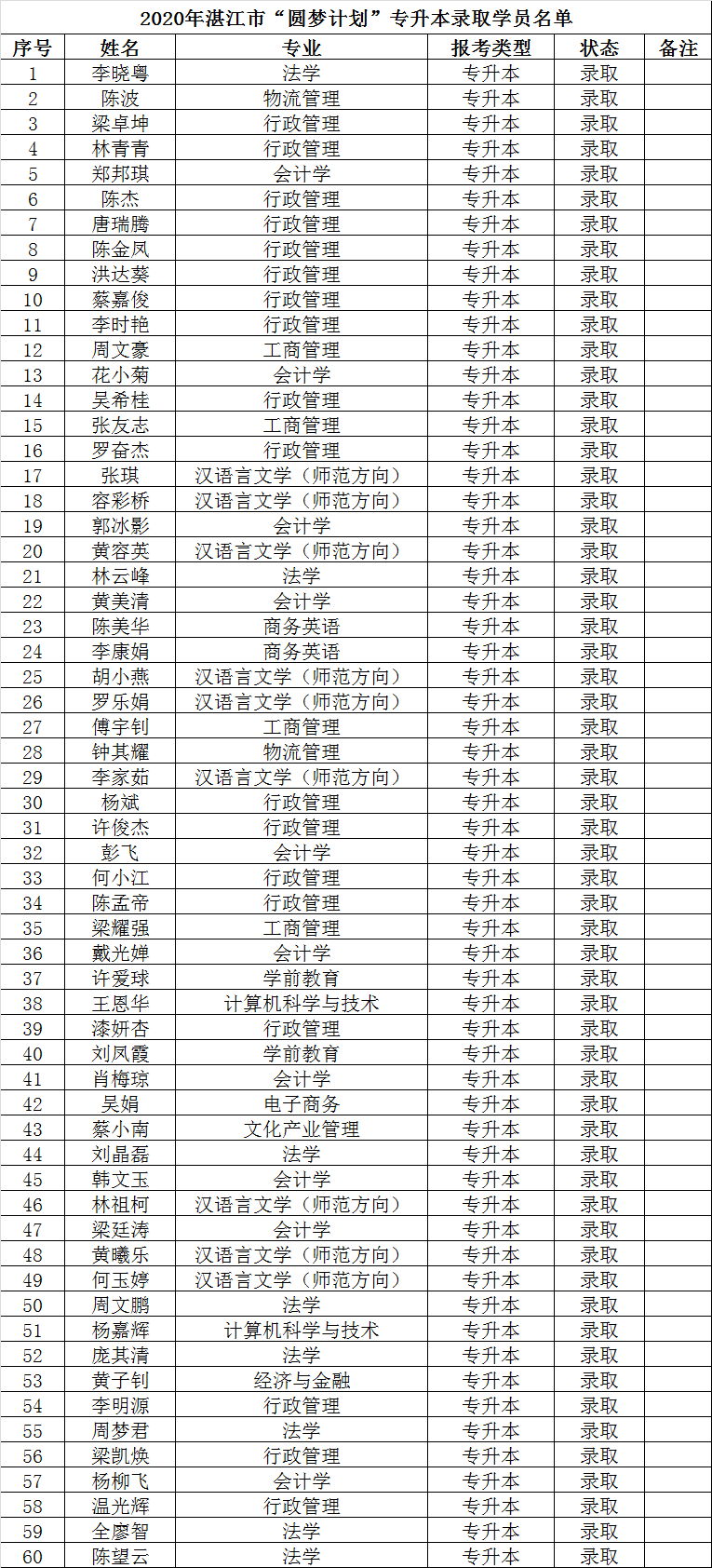 湛江开放大学2020年秋季圆梦计划资格生公示名单