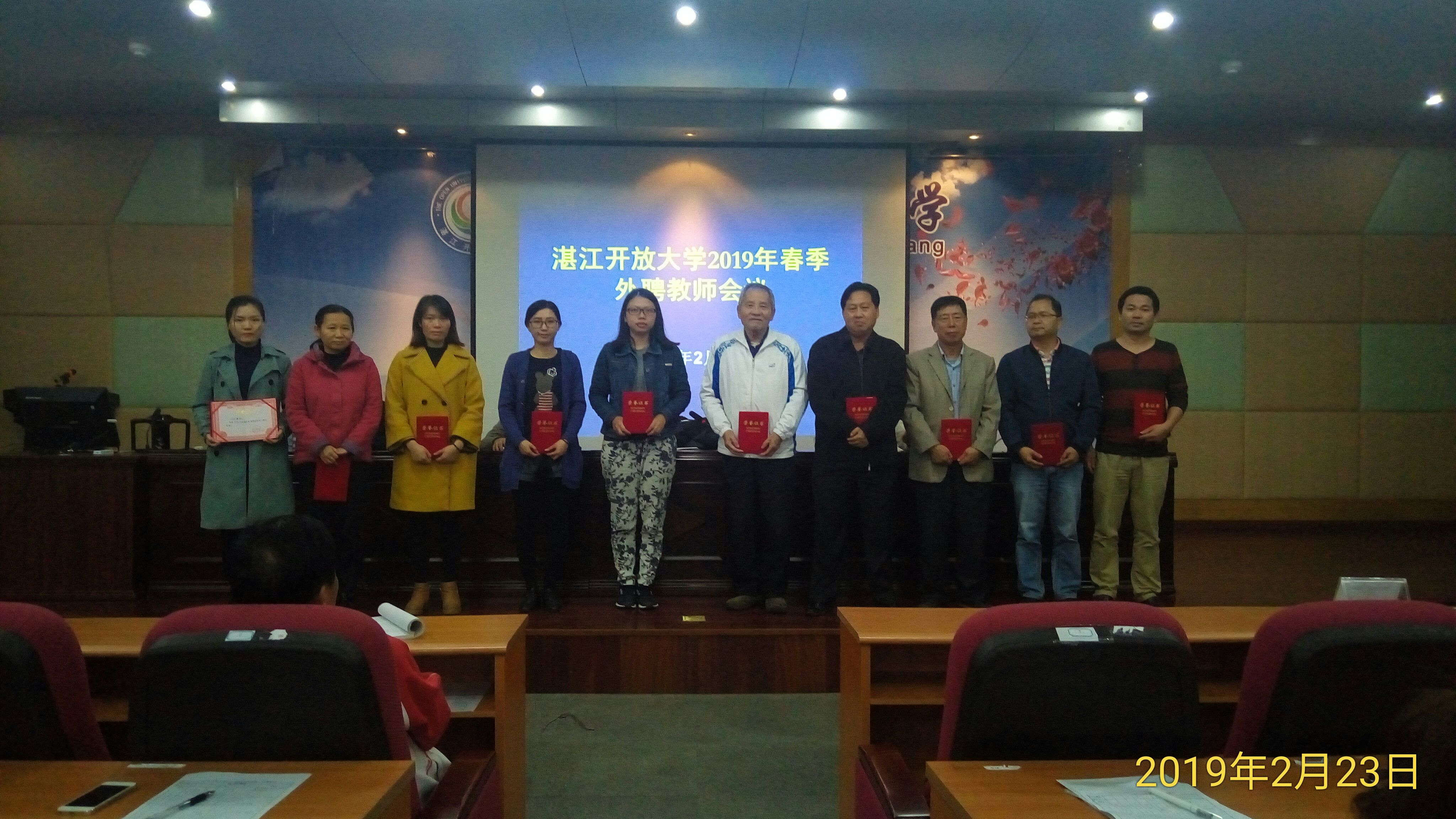 会上,尤祖国副校长宣读了学?!豆赜诒碚?span lang="EN-US">2018秋优秀外聘教师的决定》文件,并表彰了陈海妮等10名优秀外聘教师。接着,王康生副校长向大家简单介绍了开放教育的教学模式和方法,并总结2018秋季学期外聘教师的教学工作情况,最后对外聘教师今后的教学工作提出几点要求。王康生副校长希望广大外聘教师都要明确自己的教学职责,调整教学策略,严格做好各项教学工作,提高课堂教学质量,为湛江经济社会发展培养高素质人才。