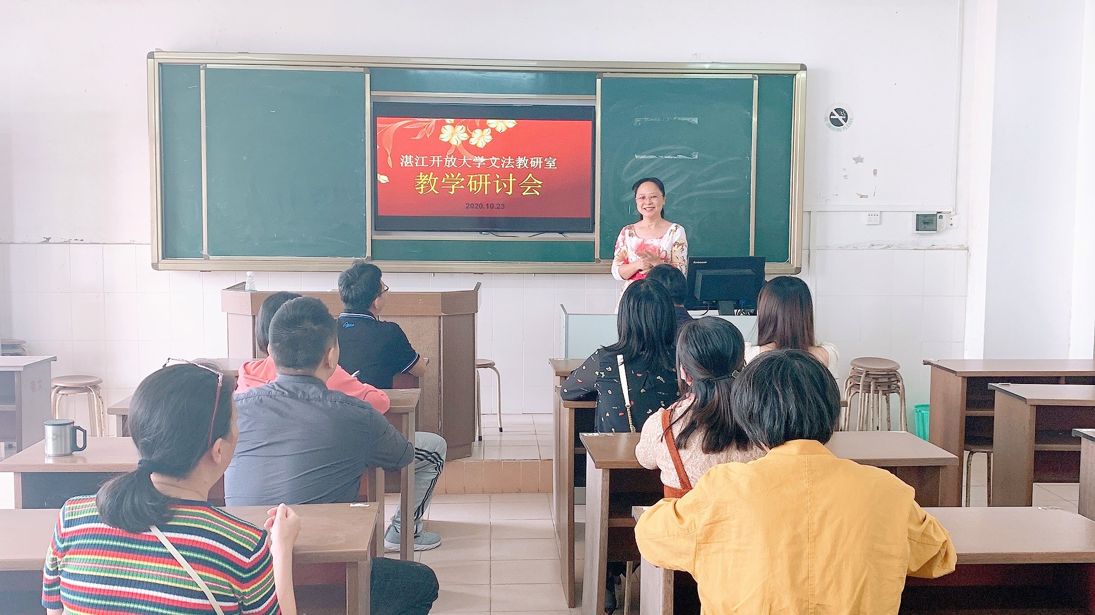 2020年10月23日星期五下午3:30在学校603教室,文法团队举行了本学期第一次教研活动,会议由文法教研室主任关一谱老师主持,文法教研室全体专职教师和湛江开放大学双肩挑部分教师参加了会议!教研主题为:如何有效开展网上教学和教研活动。主要内容:1:传达教学科关于网上教学的最新通知。2:交流网上教学经验并讨论教研活动的有效措施。