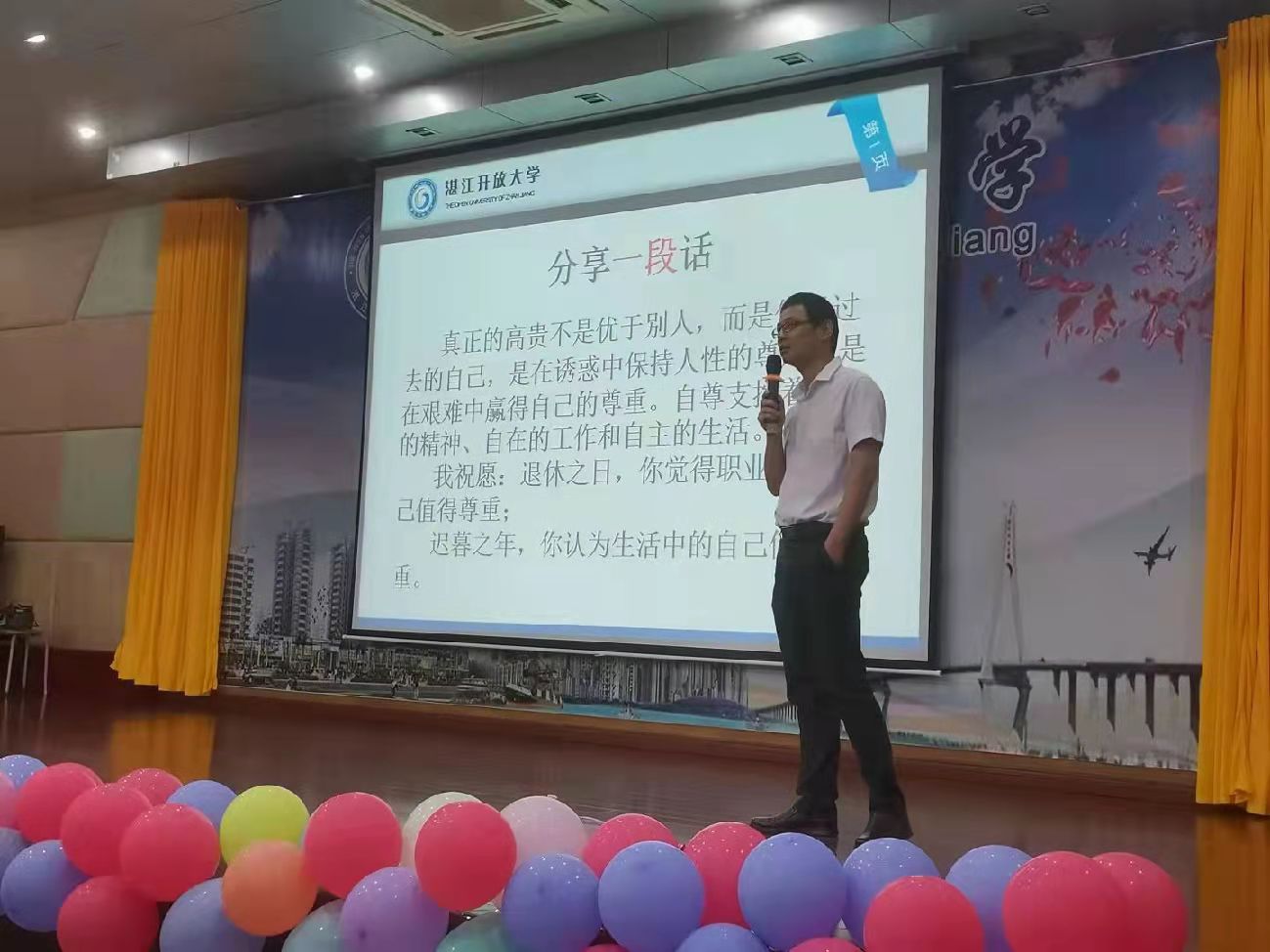 首先湛江开放大学党委副书记熊焱高同志表了热情洋溢的贺词,充分肯定学生会在各方面取得的骄人成绩, 并对学生会的未来充满期待和支持。
