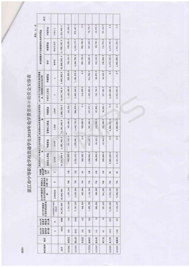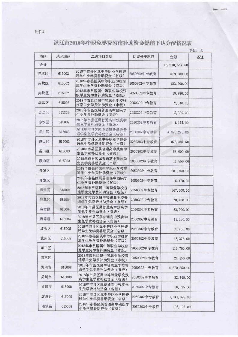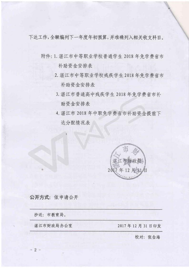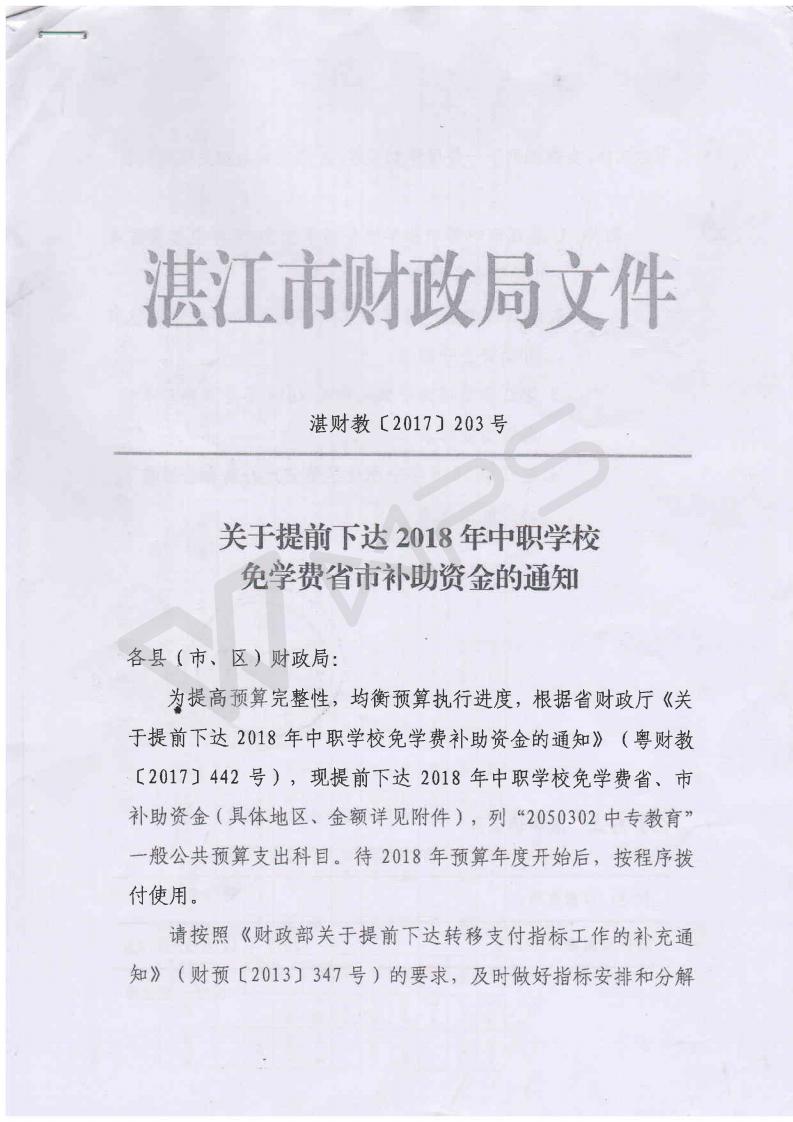 湛财教[2017]203号 关于提前下达2018年中职学校免学费省市补助资金的通知