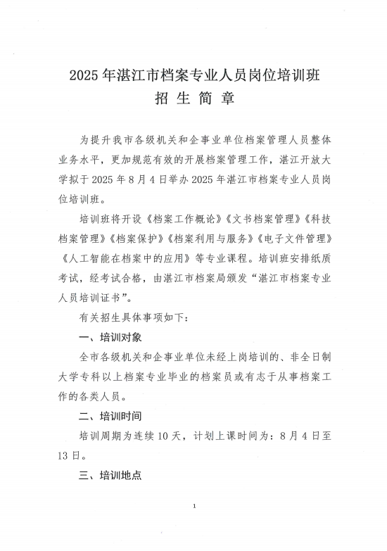 2025年湛江市档案专业人员岗位培训班招生简章