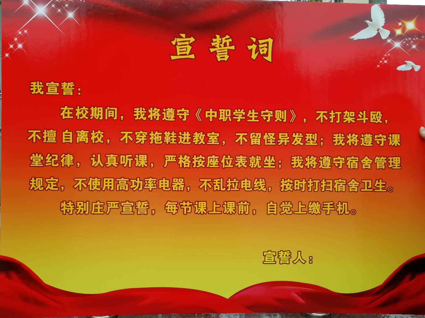宣誓仪式分五个环节:首先,全体学生干部宣誓第二,所有团员宣誓第三,班主任带领全班同学宣誓第四,集体签名第五,签名海报张贴到本班教室。各班同学宣誓时,井然有序,精神饱满,声音宏亮。举起的右手是肩负起的责任,口中的誓词是决心的见证,坚定的眼神是忠诚的彰显,誓词的每一个字都刻在了大家的心里,永不磨灭。