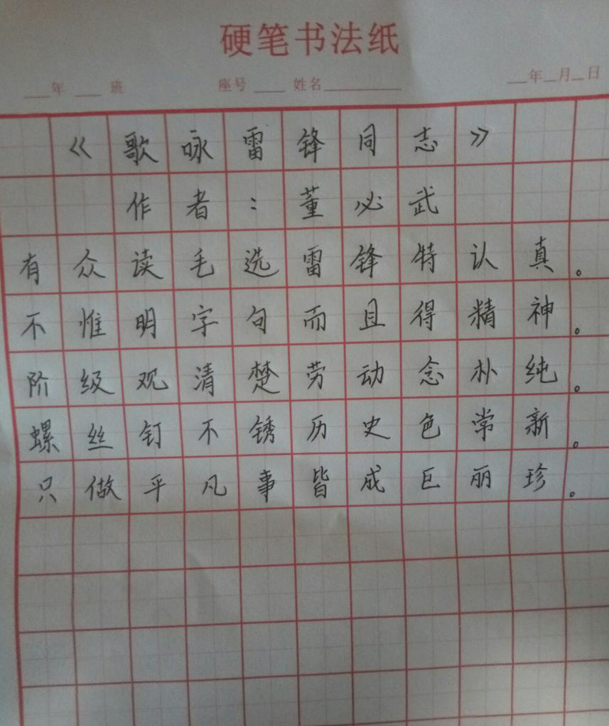 "继承传统文化,弘扬雷锋精神"硬笔书法比赛在主校区各部门领导的指导下,主校区团总支精心组织全校学生于2020年3月13日举行,截止初赛报名时间共百余名学生参与此次比赛。比赛分初赛和决赛两部分,初赛为线上投稿形式,专业老师对投稿者的作品进行筛选,待学生返校后,再举行现场书法决赛。