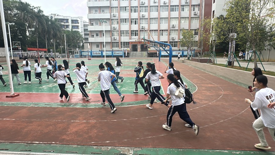 疏散中,学生秩序井然,耗时4分30秒,全校约1000名师生集结完毕。