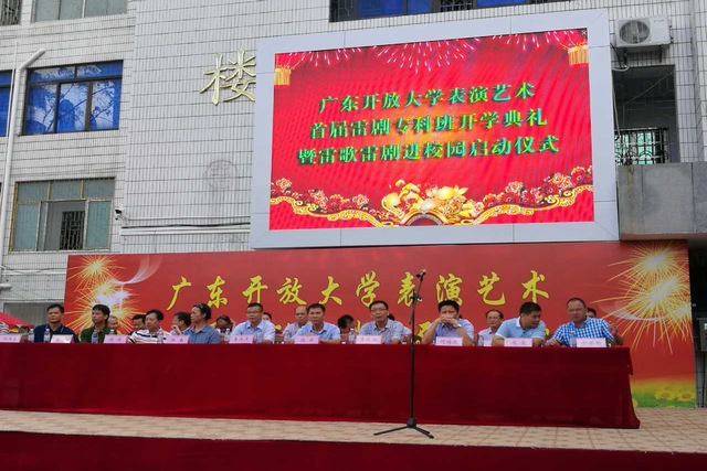 9月25日,广东开放大学表演艺术首届雷剧专科班开学典礼暨雷歌雷剧进社区进校园启动仪式在雷州市广播电视大学隆重举行。广东开放大学科技处李光先处长,湛江电大校长李连红,雷州市市委常委、宣传部长陈云,副市长何培烈,市有关部门主要领导,雷歌雷剧研究会有关领导专家,全市中小学校音乐教师代表及雷剧专科班(雷州校区)全体同学参加了活动。