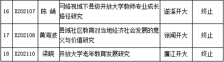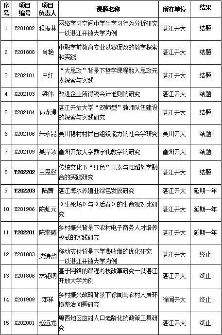 根据我??蒲泄芾砉娑?,为进一步加强在研项目的过程管理,及时督促到期项目的结项工作,提高项目研究质量、结项率和经费使用效益,经湛江开放大学学术委员会评审、学校研究决定,现将共18个科研项目结果公布如下: