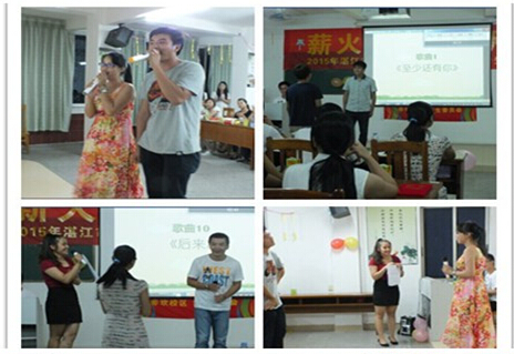 为感谢第三届学生会干部对学校工作的大力支持与无私奉献,增强学生会干部的凝聚力。2015年5月31日晚,湛江市广播电视大学赤坎校区学生会在赤坎校区教学楼举办以"薪火相传,扬帆起航"为主题的学生会干部答谢会。本次活动邀请了赤坎校区李海红主任、郭昱良副主任、团总支书郑妍妍及第三届(2014年)学生会干部参加。会上,李海红主任、郭昱良副主任、郑妍妍书记以及前任学生会主席王俊杰给新一届学生会干部们颁发聘书。同时,新一届学生会干部给卸任的第三届学生会干部赠送纪念品,以表谢意。李海红主任代表校团委和赤坎校区,对上一届学生会干部的工作给予了肯定,并对新一届学生会干部提出三点希望:一是希望大家在学生会这个大舞台能得到锻炼和成长、二是学生会干部在工作上要有所担当,一切工作要以学校和校团委的中心工作这个大局为重、三是要传承学生会的优良传统,发挥学生会桥梁和纽带作用。同时祝愿赤坎新一届学生会在今后工作中继续开创新局面、再创佳绩。整个答谢会现场通过开展一系列趣味游戏--"歌名猜猜猜"、"成语造句"等,为晚会现场营造出轻松、和谐、快乐的气氛,最后答谢会以一首《感恩的心》手语表演完美落幕。