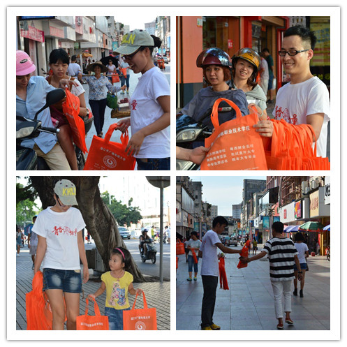 赤坎校区学生会干部,穿着统一服装,满怀热情,从学校出发,分别往中山路步行街方向和凯德广场、世贸商场方向派发环保袋和招生简章,宣传湛江电大终身学习理念,向市民介绍湛江电大的办学特色和亮点。