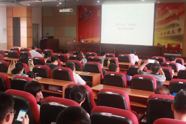 此次讲座由具有丰富的教学工作经验和深厚的文字功底的梁海铭老师进行授课。培训课程涉及公文基础知识,公文的文面格式,公文的行文规则,公文常用文种等6个方面内容。梁老师通过多媒体PPT课件演示,结合亲身体验,理论结合实际,从规范办文、公文病例浅析、范文实例欣赏等方面讲授了如何规范处理公文和写作公文的技巧。整个讲座内容丰富,重点突出,具有较强的实用性和针对性。