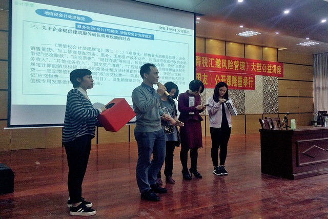讲座上,秦文燕老师首先讲解了"金税三期"新系统下,增值税会计处理相关规定、增值税发票风险防控、2016年度企业所得税汇算最新政策、营改增对年度所得税汇算影响的重要政策以及个人所得税热点税收问题及税收风险防范等重要内容。讲座过程中,秦文燕老师频频与学员互动,学员们积极提出了自己的疑问,对此,秦文燕老师结合经典案例也一一作了解答。讲座现场还进行了有奖互动问答及抽奖,将现场气氛推向了高潮。讲座结束后,参加活动的学员们均表示受益匪浅,对财税中的新变化、新风险有了清晰的认识。