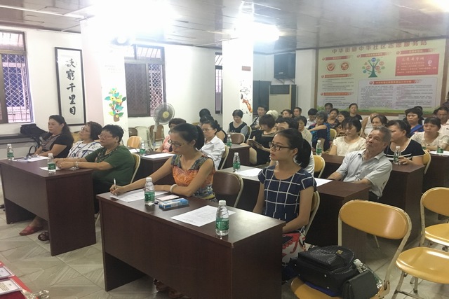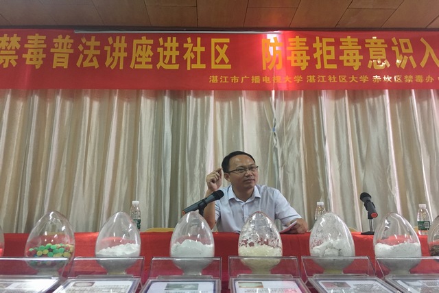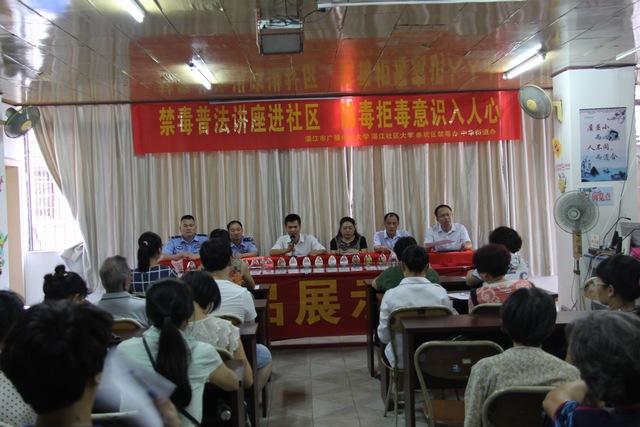 9月26日上午,湛江市广播电视大学、湛江社区大学联合赤坎区中华街道办在中华社区开展了"禁毒普法讲座进社区,防毒拒毒意识入人心"为主题的禁毒宣传讲座活动。本次活动由湛江电大招生就业办科长黄丛义主讲、赤坎区禁毒办副大队长黄日盈同志、中华街道办事处主任陈汉权同志、中华街道党工委副书记黄绍盈同志及中华社区居民参加了讲座。