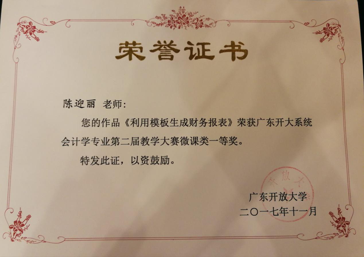 近日,广东开放大学经济管理与标准化学院举办了广东开放大学系统第二届会计学专业教学大赛。我校在大赛中喜获优秀组织奖。其中,陈迎丽老师微课作品《利用模板生成财务报表》获微课类一等奖罗凡老师微课作品《如何创建账套》获微课类二等奖。