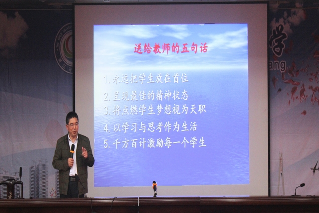 在讲座的最后,他特别指出,教师要永远把学生放在首位,呈现最佳的精神状态,将点燃学生的精神视为天职,以学习与思考作为生活,千方百计激励每一位学生。会场响起了赞同的掌声,不绝于耳。