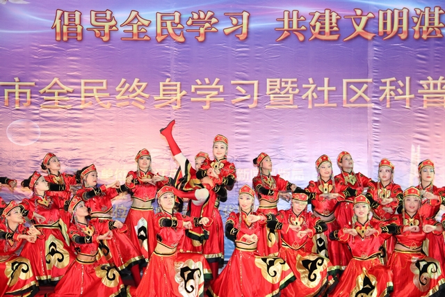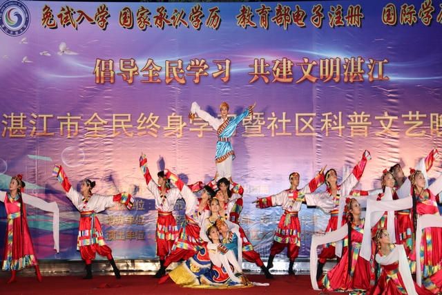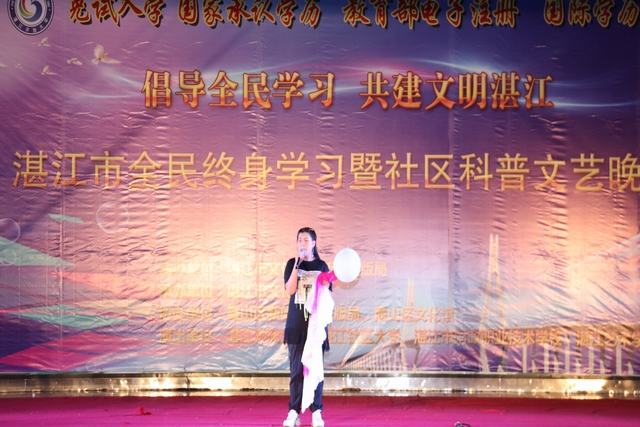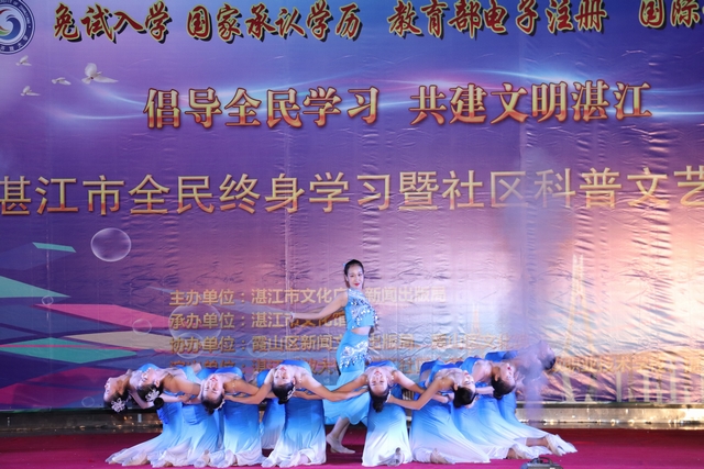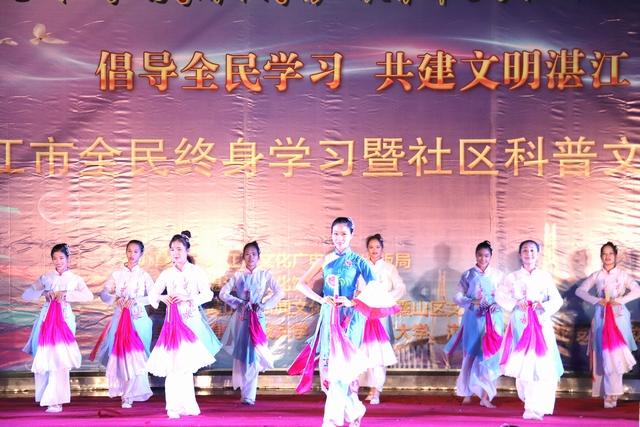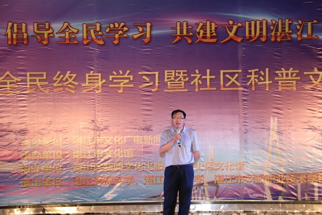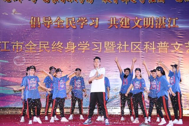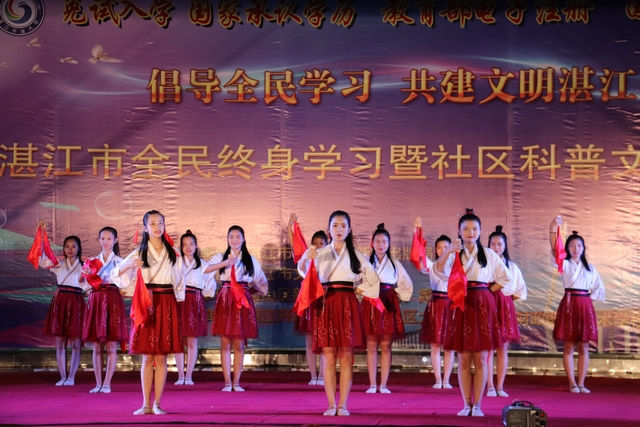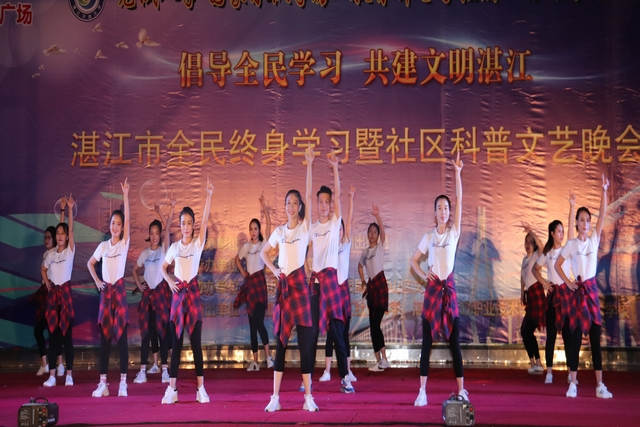 6月16日晚,由市文广新局、市文化馆、湛江开放大学、湛江社区大学、湛江市财政职业技术学校等单位联合举办的"倡导全民学习 共建文明湛江"湛江市全民终身学习暨社区科普文艺晚会在霞山商业步行街开心广场举行,来自多个单位的代表、学校师生和市民逾千人观看了演出。