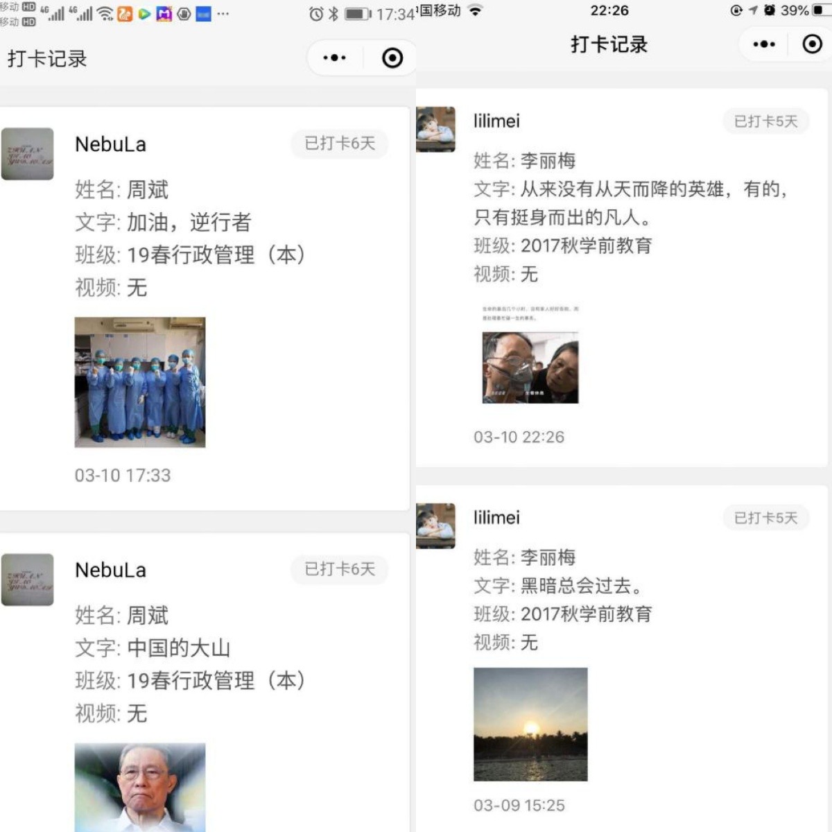 全民宅家的三月,我校师生通过微信平台每日打卡,在线上分享生活点滴,期间涌现出很多"活雷锋"。梁鸿杰、黄德才同学冲在一线,参加了社区抗击疫情志愿服务陈鹏飞、罗兵伟等同学坚持每天在家运动,提高抵抗力吴嘉琳等同学积极分享抗疫知识,传达正能量黎伟文等同学宅家线上办公,创新工作模式林月球等同学积极向烘焙达人靠拢,发掘生活新技能谭兰芳等同学则每天分享宅家亲子趣事,其乐融融。我校以这样一个特别的形式拉开了"践行雷锋精神 全民志愿战疫"的雷锋活动月的帷幕,师生相互鼓励,营造了和谐氛围。