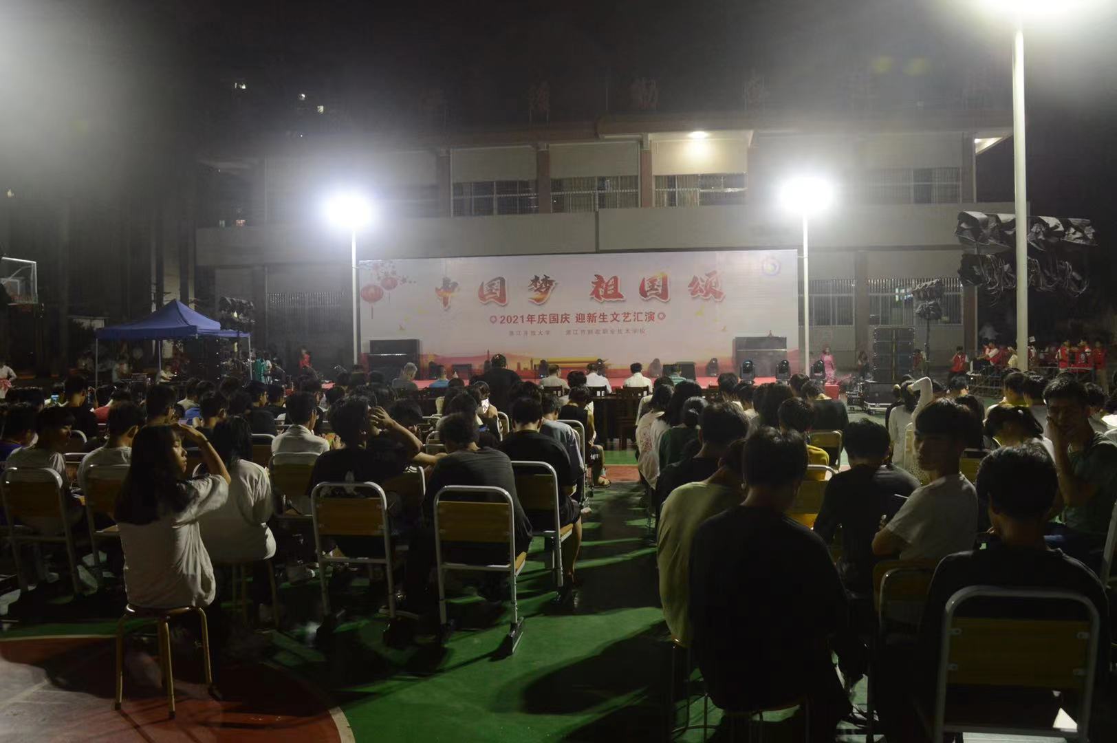 9月29日晚,湛江开放大学 湛江市财政职业技术学校于篮球场举办以"中国梦 祖国颂"为主题的2021年庆国庆、迎新生文艺汇演。学校党委副书记熊焱高同志、副校长吴瑾同志等领导及教职工代表出席晚会,与学生欢聚一堂,共同观赏了文艺汇演。