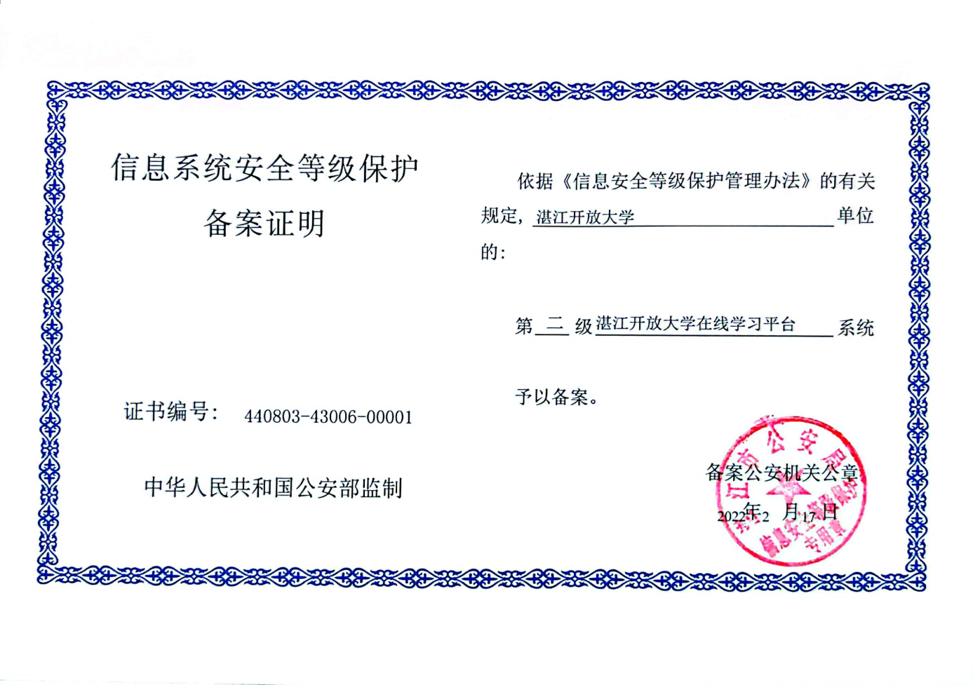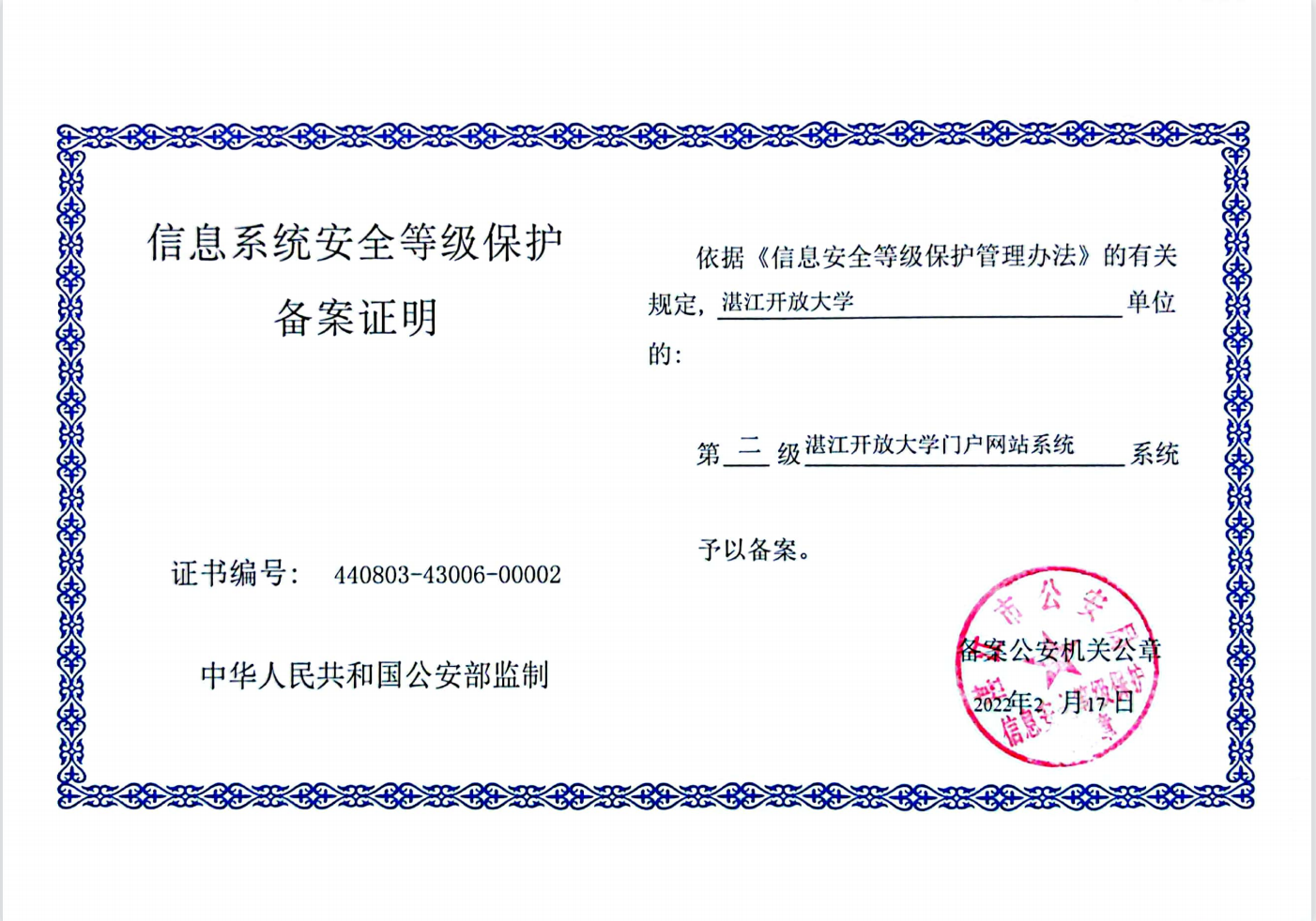 保障信息系统安全是维护校园安全稳定的一项重要工作。近日,我校官网、在线学习平台顺利通过信息系统安全等级测评,获得公安部门颁发的信息系统安全等级?;?.0备案证书。