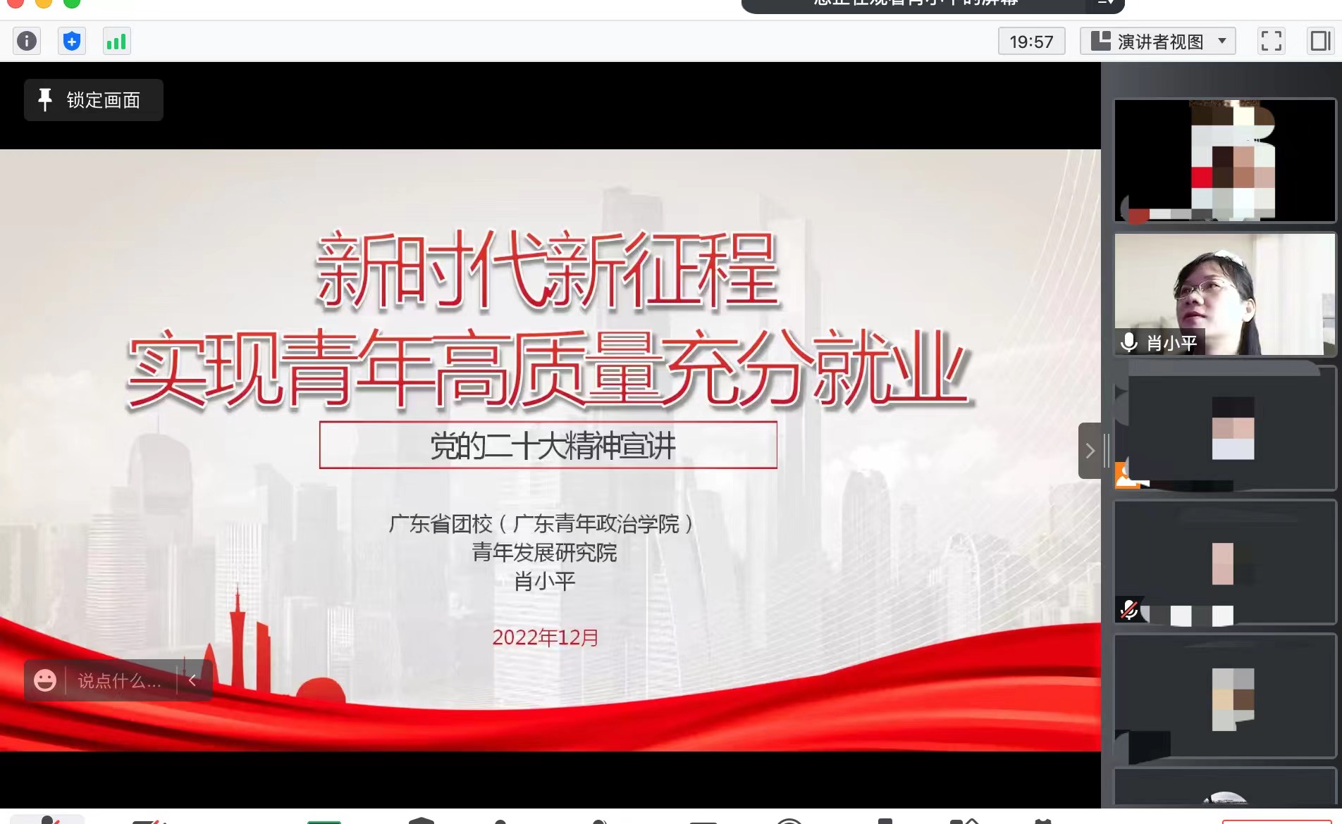 12月30日下午,为进一步学习党的二十大精神,使青年同志们明确在新征程上的使命任务与责任担当,省团校(广东青年政治学院)青年发展研究院肖小平副院长应邀通过线上会议的方式为我校全体师生作“新时代新征程  实现青年高质量充分就业”党的二十大精神宣讲。