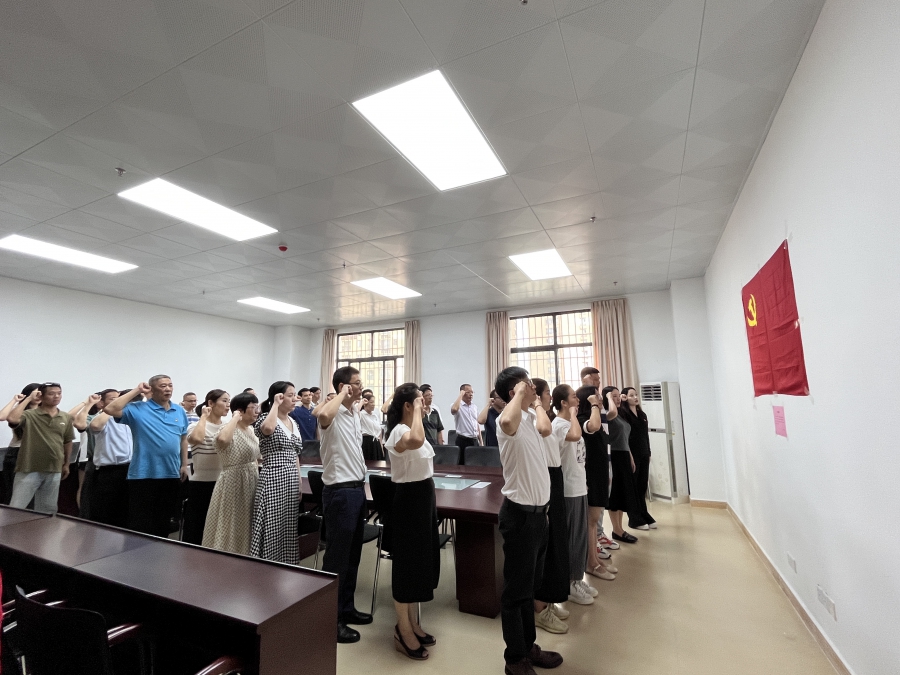 我校6名预备党员面对党旗庄严宣誓,其他党员同志重温入党誓词。