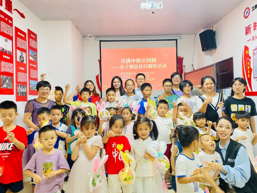9月22日,湛江开放大学、湛江社区大学、湛开大团委、湛开大关工委联合工农街道办工农社区、樱子艺术,在霞山工农社区党群服务中心为儿童公益课堂的学员,举办亲子创意花灯制作活动。