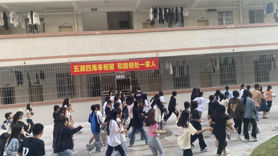 下午440分警报响起,学校应急疏散演练指挥部总指挥首先下达指令:“地震了!请同学们迅速躲在桌子底下!”接着,再次下达“教学楼发生火灾,请同学们立即撤离”的命令。各位班主任老师迅速到达各班级,协助上课老师一起组织学生疏散。耗时130秒,在校700余名师生全部安全疏散完毕。