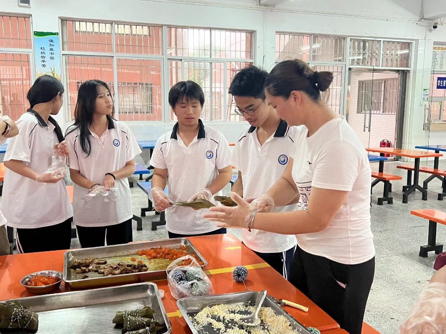 大家欢聚一堂,一起包粽子。同学们按捺不住内心的热情,跃跃欲试,有熟悉的、有生疏的、有现学的,十分热闹?;岚兆拥陌⒁滔殖〈诩记?,耐心指导,不会包粽子的同学虚心学习,认真上手实践,逐渐掌握了包粽子的窍门。