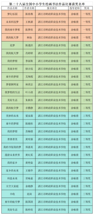 2024年6月26日,第二十八届全国中小学生绘画书法作品比赛成绩揭晓,湛江市财政职业技术学校共有26名学生斩获佳绩。学前教育专业学生陈春燕、王秋湄、陈梦欣、林灿4位学生获一等奖;陈漫洪、肖婷婷等9位学生获二等奖;梁家茵、陈晓彤等13位学生获三等奖。
