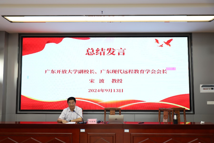 会议第三大部分,广东开放大学副校长、广东现代远程教育学会会长宋波进行了总结发言。宋波副校长对本次会议进行了全面而深入的总结,充分肯定了各位专家学者和高校领导的精彩报告和发言,同时对未来终身学习的数字化转型与开放教育的发展提出了殷切期望和明确方向。相信在广东开放大学体系的各位专家学者和教育工作者的共同努力下,我省的终身学习和开放教育事业将迎来更加辉煌的明天。