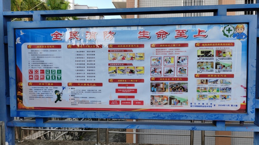 电子屏滚动播放的消防警醒语、校园内醒目横幅上的警示标语,以及宣传栏中丰富全面的消防知识,向师生传递消防安全意识。