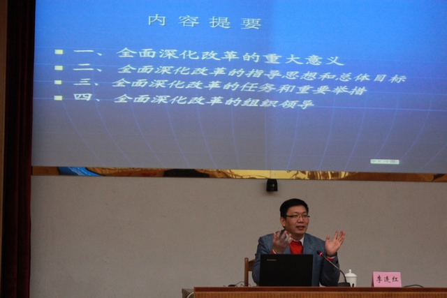 报告会上,李连红校长对党的十八届三中全会作了详细介绍,结合改革开放的生动实践,以通俗易懂的语言,用回顾与对比,通过众多事例,从全面深化改革的重大意义、全面深化改革的指导思想和总体目标、全面落实中央确定的改革任务和重大举措、切实加强和改善党对全面深化改革的领导等方面对十八届三中全会《决定》进行了系统阐述,重点对《决定》一系列新政策、新要求、新任务进行了详细解读,让与会听众获益匪浅。