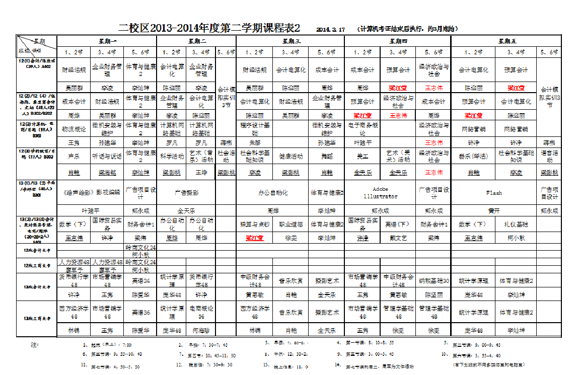 - 主校区(湛江市财政职业技术学校)2013-2014年度第二学期课程表2 2014.3.17 (计算机考证结束后执行,约3月底始)