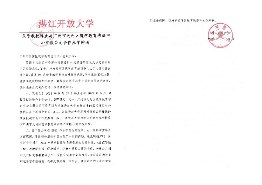 关于我校终止与广州市天河区筑学教育培训中心有限公司合作办学的函